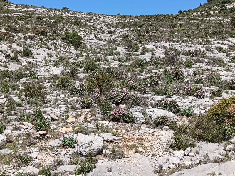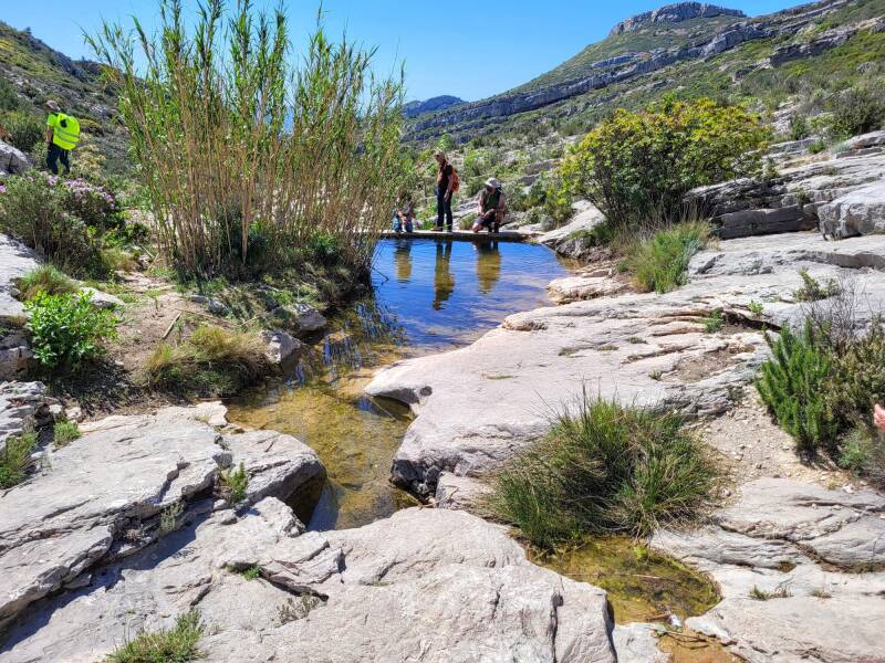 Le groupe se remet en marche en direction du vallon des Escaouprès. Après les quelques pluies du printemps, la nature nous offre un spectacle magnifique. Le chemin passe sous Tête Ronde et devant l’ancienne mine de bauxite, pour atteindre la source du chien.(440 m)